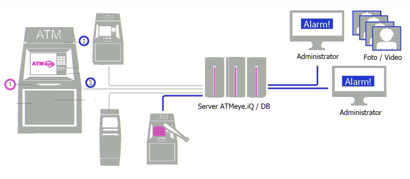 ATMeye.iQ este o soluţie software integrată, care asigură securitatea şi protecţia echipamentelor de autodeservire. Sistemul efectuează, în regim de 24 de ore, monitorizare de la distanţă a tuturor acţiunilor în perimetrul echipamentelor de autodeservire, reducând astfel riscul asociat cu frauda şi vandalismul. De asemenea, ajută la rezolvarea disputelor cu clienţii. Soluţia permite desfăşurarea monitorizării şi a prevenirii activităţilor suspecte în timp real, incluzând (detalii aici ):
