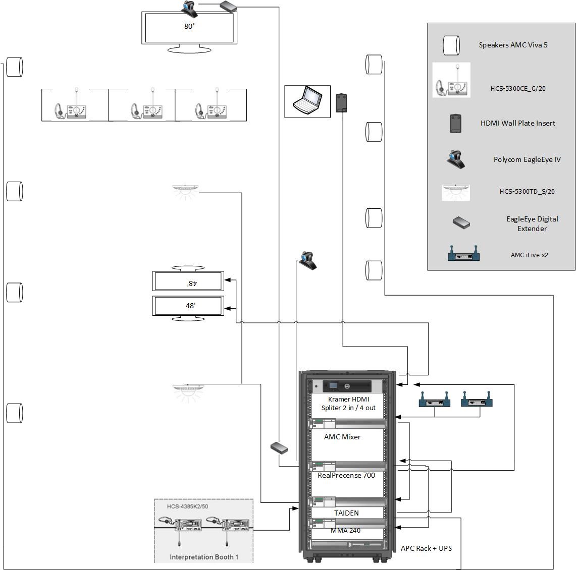 Drept sursă audio pentru video conferinţe vor servi staţiile cu microfoane Taiden şi AMC radio microfoane. În sala de şedinţe sînt montate 2 TV LED cu diagonala de 48" şi un TV de 80". La aceste TV-uri se vor proiecta imagini din locaţiile externe. Modul amplasării TV-ului în sală oferă o vizualizare confortabilă a imaginii tuturor participanţilor la video conferinţă.