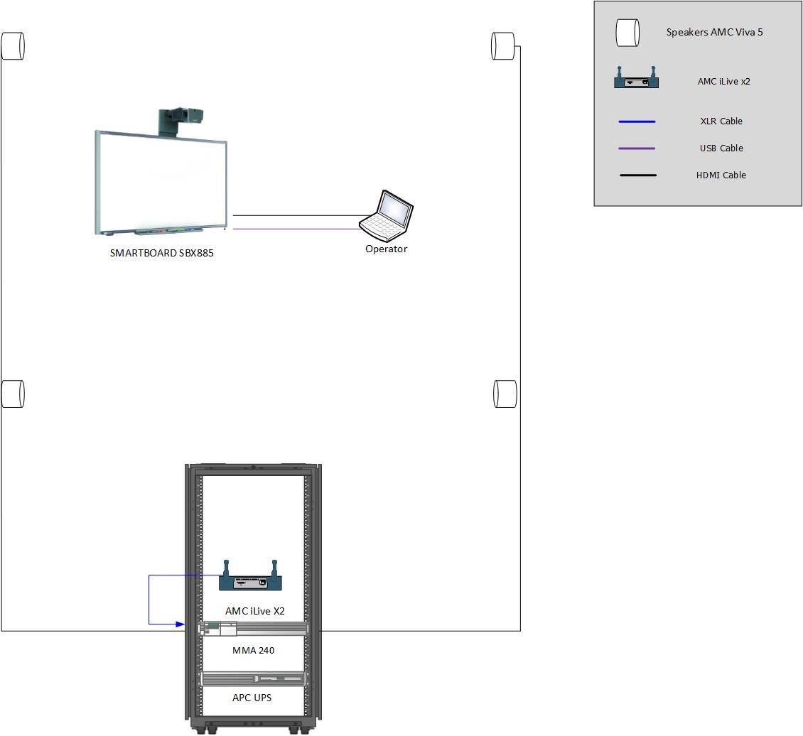 Echipamentele sînt amplasate în sala adiacentă. Ele sînt montate într-un dulap de tip rack şi sînt alimentate de un APC UPS (sursa de alimentare neîntreruptibilă).